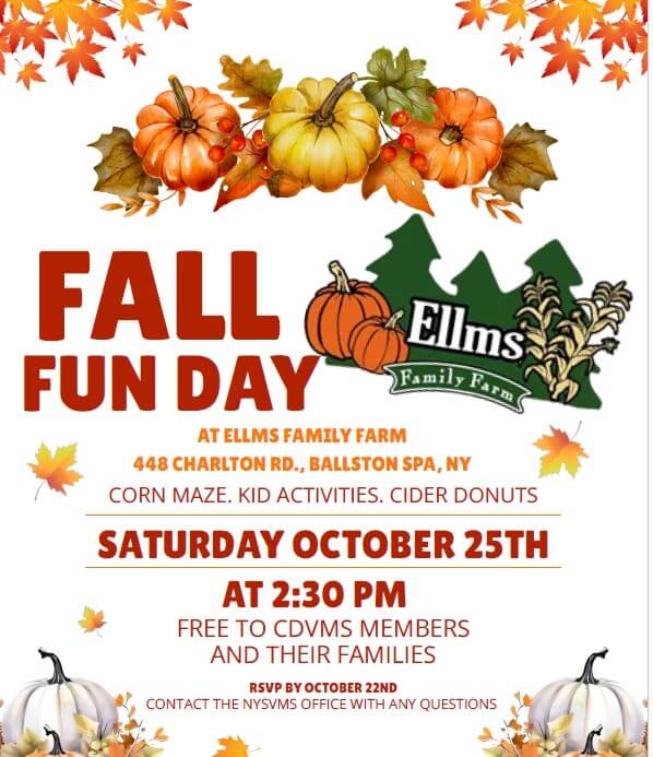 The Capital District Veterinary Medical Society is delighted to invite all registered members and their families for a special day out at Ellms Family Farm! Join us for an unforgettable afternoon filled exploring the Fall attractions and activities the farm has to offer.